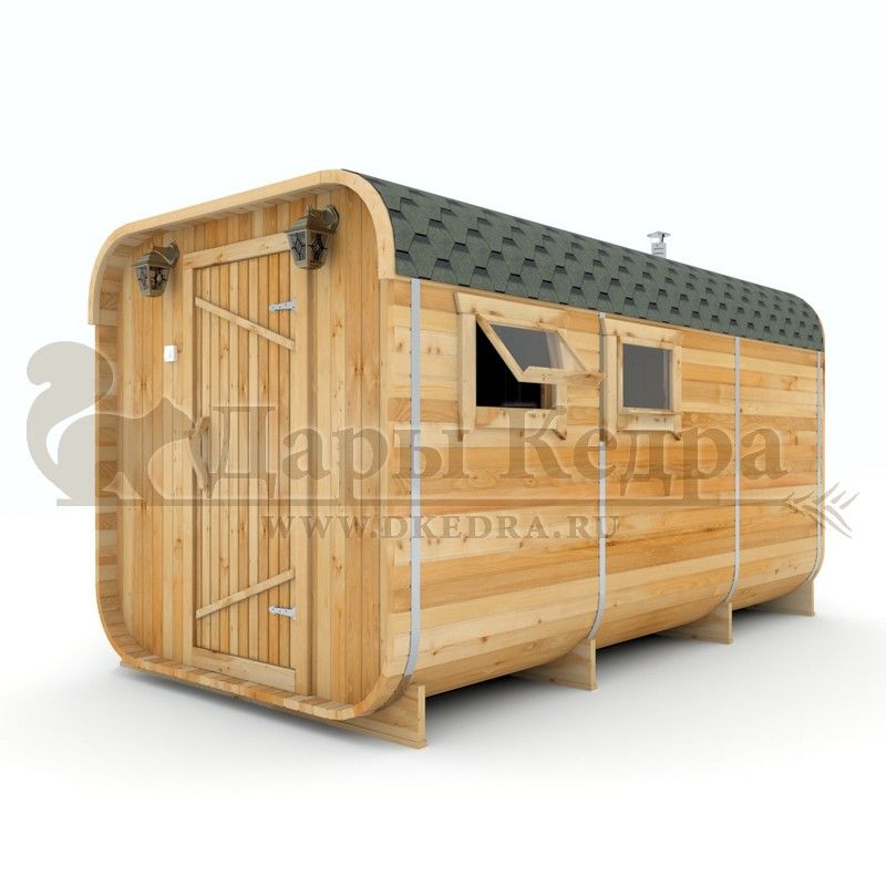 Баня-бочка буханка из кедра 3,5 метра Это более просторная модель за счет увеличенной высоты потолков и ровного пола. В такой модели раздевалка совмещена с моечной. Тут установлен душевой поддон, вешалка, полочка и лавочка из кедра. В парильном отделении по обе стороны расположены двухуровневые открытые полки, печь находится между ними у дальней стены. Время растопки такой бани не превышает 30 минут. По вашему желанию баню-бочку можно укомплектовать козырьком, верандой и печью с внешней загрузкой, благодаря которой весь мусор во время топки остается на улице. Баня-бочка буханка не требует полноценный фундамент, поэтому при необходимости ее можно перенести в другое место. Обращаем Ваше внимание, что в стандартную комплектацию бани входят полки открытого типа в парной с обеих сторон. Дополнительно можно заказать полок закрытого типа или лавку! Кедр обладает ароматическими свойствами. Он не деформируется и влагоустойчив, при правильном уходе за деревом на нем не развиваются грибки и плесень. , ,