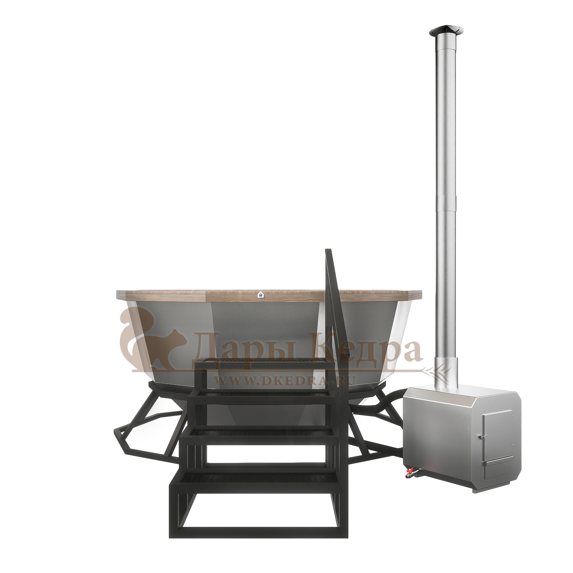 Банный чан из нержавеющей стали Ø-2000 на подставке с приставной печью Банный чан с приставной печкой изготовлен из пищевой стали. Представляет собой большую ёмкость в виде чаши, при нагревании которой можно париться на свежем воздухе. Чан установлен на устойчивую металлическую подставку и оснащен приставной печью с дымоходом. Банный чан оборудован кедровым бортом, скамейками, подспинниками, трапом для ног и приставной лестницей.