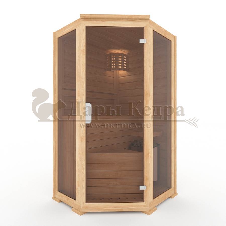 Одноместная угловая финская сауна кабина из кедра с электрокаменкой Это специально оборудованная деревянная кабина для сухого и влажного парения. Электропечь нагревает пространство внутри и позволяет сбрызгивать камни водой, слегка увлажняя воздух. Такая процедура позволяет избежать перегрева. Двойные стенки кабины с теплоизоляционным материалом удерживают тепло. Установка сауны в угол позволяет рационально использовать пространство помещения. Финская сауна с электропечью подойдет как для домашнего использования, так и для коммерции. Доставляется в разборном виде щитами, собирается по инструкции с помощью шуруповёрта. Обращаем Ваше внимание, что в стоимость сауны уже включена дверь с закаленным стеклом в раме из кедра с фиксатором и деревянным фасадом. Вы можете заменить фасад на цельностеклянный с безрамной дверью за дополнительную плату. Нагреваясь, древесина кедра выделяет полезные вещества-фитонциды, которые благотворно влияют на организм в целом и укрепляют иммунитет. , ,