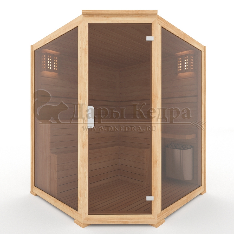 Трехместная угловая финская сауна кабина из кедра с электрокаменкой Это специально оборудованная деревянная кабина для сухого и влажного парения. Электропечь нагревает пространство внутри и позволяет сбрызгивать камни водой, слегка увлажняя воздух. Такая процедура позволяет избежать перегрева. Двойные стенки кабины с теплоизоляционным материалом удерживают тепло. Установка сауны в угол позволяет рационально использовать пространство помещения. Финская сауна с электропечью подойдет как для домашнего использования, так и для коммерции. Доставляется в разборном виде щитами, собирается по инструкции с помощью шуруповёрта. Обращаем Ваше внимание, что в стоимость сауны уже включена дверь с закаленным стеклом в раме из кедра с фиксатором и деревянным фасадом справа. Вы можете заменить фасад на цельностеклянный с безрамной дверью за дополнительную плату. Нагреваясь, древесина кедра выделяет полезные вещества-фитонциды, которые благотворно влияют на организм в целом и укрепляют иммунитет. , ,