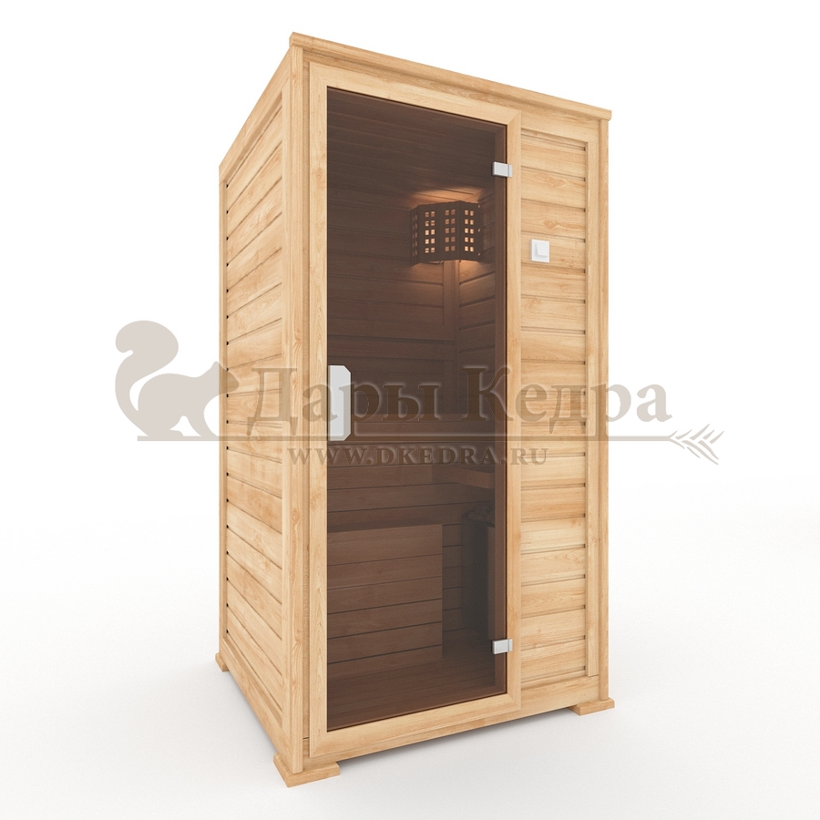 Одноместная финская сауна кабина из кедра с электрокаменкой Это специально оборудованная готовая деревянная кабина для сухого и влажного парения. Электропечь нагревает пространство внутри и позволяет сбрызгивать камни водой, слегка увлажняя воздух. Такая процедура позволяет избежать перегрева. Сауна обшита снаружи и внутри кедровой вагонкой и имеет теплоизоляционный слой. Финская сауна с электропечью подойдет, как для домашнего использования, так и для коммерции. Доставляется в разборном виде щитами, собирается по инструкции с помощью шуруповёрта. Обращаем Ваше внимание, что в стоимость сауны уже включена дверь с закаленным стеклом в раме из кедра с фиксатором и деревянным фасадом справа. Вы можете заменить фасад на цельностеклянный с безрамной дверью за дополнительную плату. Нагреваясь, древесина кедра выделяет полезные вещества-фитонциды, которые благотворно влияют на организм в целом и укрепляют иммунитет. , ,