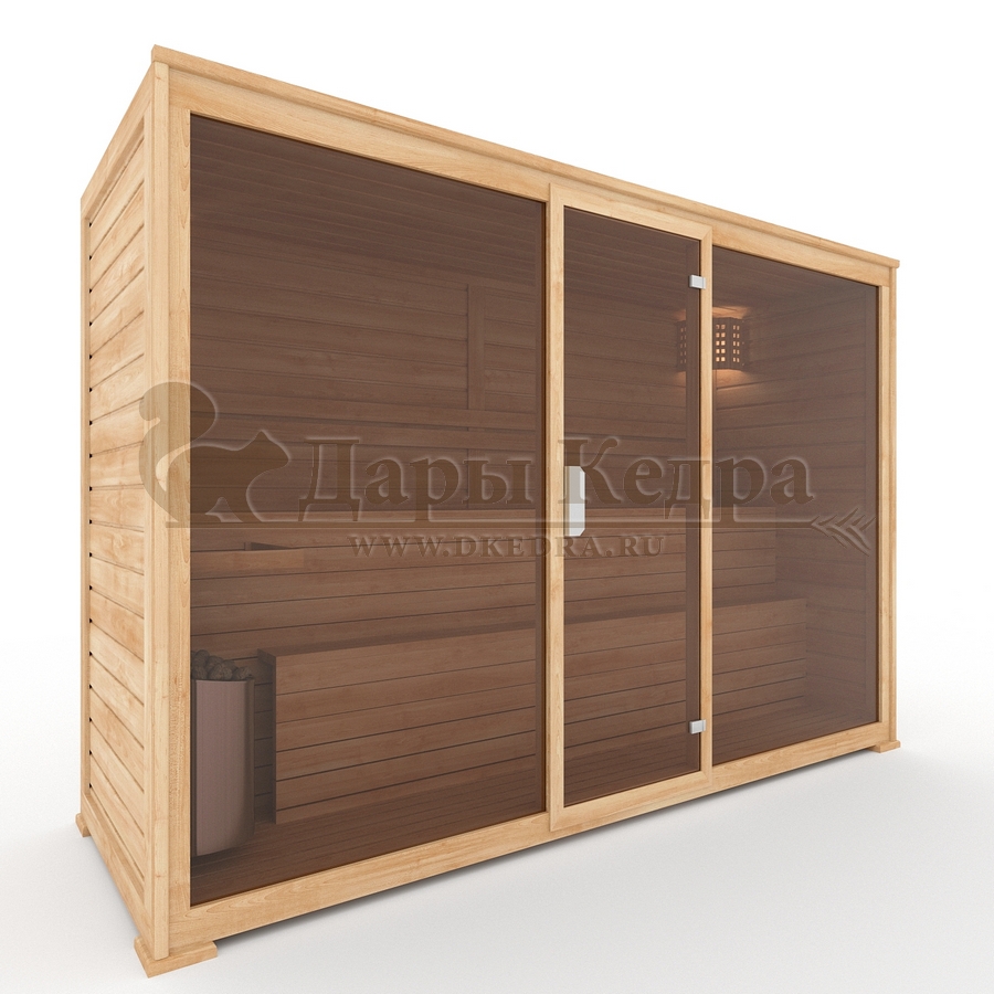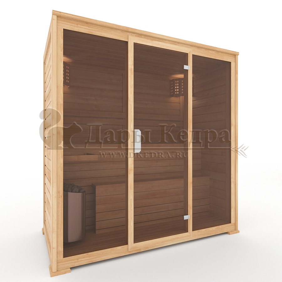 Трехместная финская сауна кабина из кедра с электрокаменкой Это специально оборудованная готовая деревянная кабина для сухого и влажного парения. Электропечь нагревает пространство внутри и позволяет сбрызгивать камни водой, слегка увлажняя воздух. Такая процедура позволяет избежать перегрева. Сауна обшита снаружи и внутри кедровой вагонкой и имеет теплоизоляционный слой. Финская сауна с электропечью подойдет, как для домашнего использования, так и для коммерции. Доставляется в разборном виде щитами, собирается по инструкции с помощью шуруповёрта. Обращаем Ваше внимание, что в стоимость сауны уже включена дверь с закаленным стеклом в раме из кедра с фиксатором и деревянным фасадом справа. Вы можете заменить фасад на цельностеклянный с безрамной дверью за дополнительную плату. Нагреваясь, древесина кедра выделяет полезные вещества-фитонциды, которые благотворно влияют на организм в целом и укрепляют иммунитет. , ,