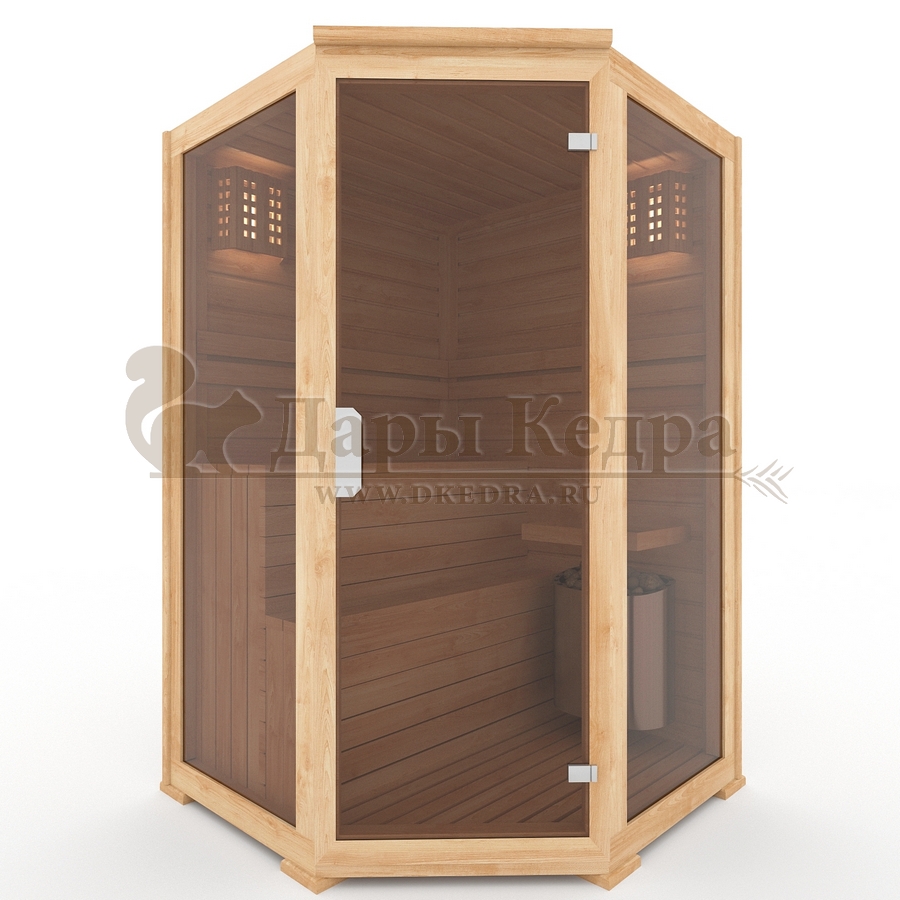 Двухместная угловая финская сауна кабина из кедра с электрокаменкой Это специально оборудованная деревянная кабина для сухого и влажного парения. Электропечь нагревает пространство внутри и позволяет сбрызгивать камни водой, слегка увлажняя воздух. Такая процедура позволяет избежать перегрева. Двойные стенки кабины с теплоизоляционным материалом удерживают тепло. Установка сауны в угол позволяет рационально использовать пространство помещения. Финская сауна с электропечью подойдет как для домашнего использования, так и для коммерции. Доставляется в разборном виде щитами, собирается по инструкции с помощью шуруповёрта. Обращаем Ваше внимание, что в стоимость сауны уже включена дверь с закаленным стеклом в раме из кедра с фиксатором и деревянным фасадом справа. Вы можете заменить фасад на цельностеклянный с безрамной дверью за дополнительную плату. Нагреваясь, древесина кедра выделяет полезные вещества-фитонциды, которые благотворно влияют на организм в целом и укрепляют иммунитет. , ,