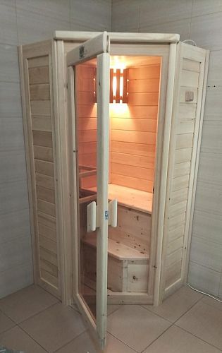 Компактно достаточно разместилась угловая сауна у нас в ванной комнате, брали одноместную с карбоновыми нагревателями. Греет по ощущениям не сильно жарко, но нам такую и надо было, чтобы и дети, и пожилые родители смогли принимать процедуры. Щадящая сауна - то, что нужно! Погреться после зимних интенсивных прогулок с чашкой ароматного чая - просто супер! Нам всем нравится. Рекомендую!